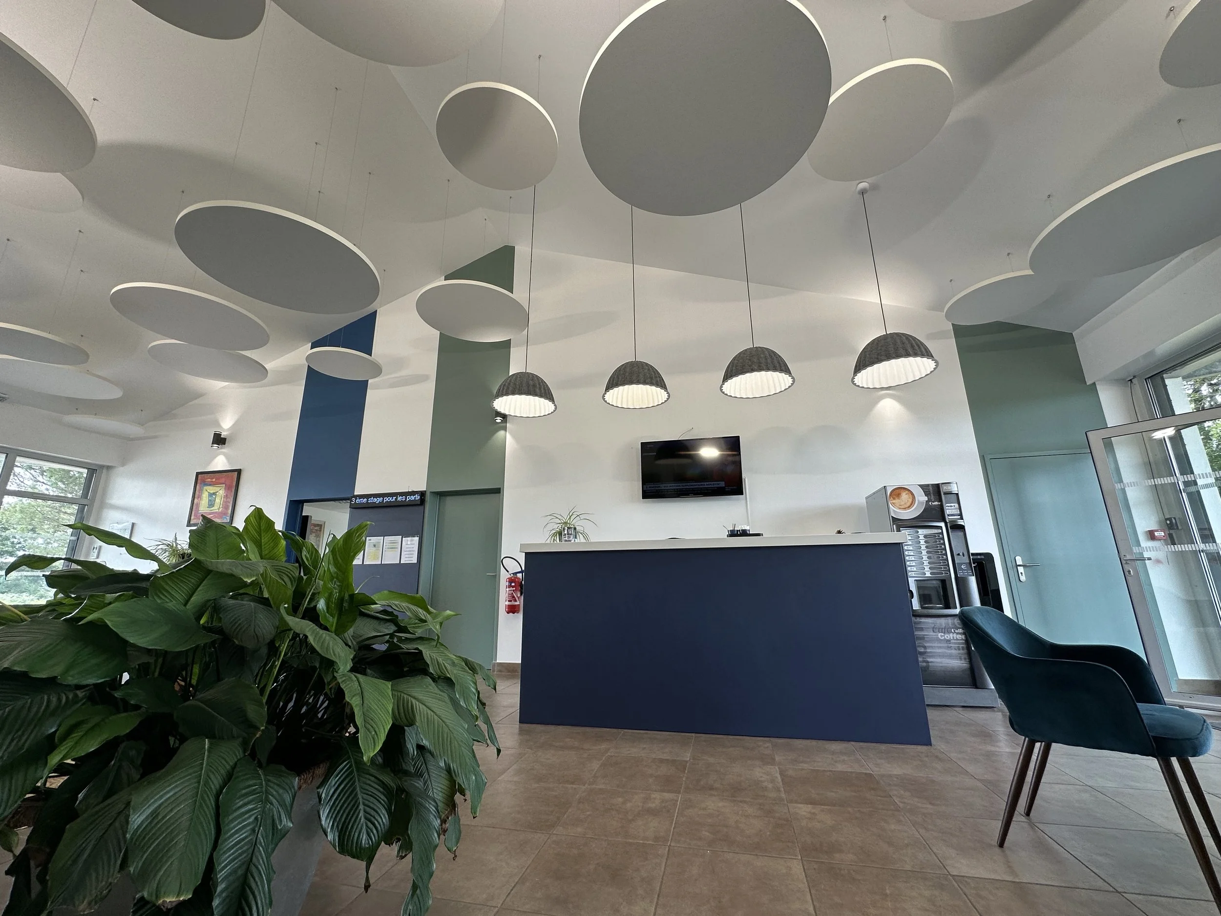 L’objectif était de traiter les problématiques de luminosité, d’acoustique et vieillissement de l’espace. En somme, moderniser ce hall datant de la construction du bâtiment. Nous avons travaillé sur les éclairages, les agencements existants, l’ajout de panneaux acoustiques, agrémenter avec de la couleur et remplacer le mobilier. Un nouveau hall plus accueillant, plus actuel !